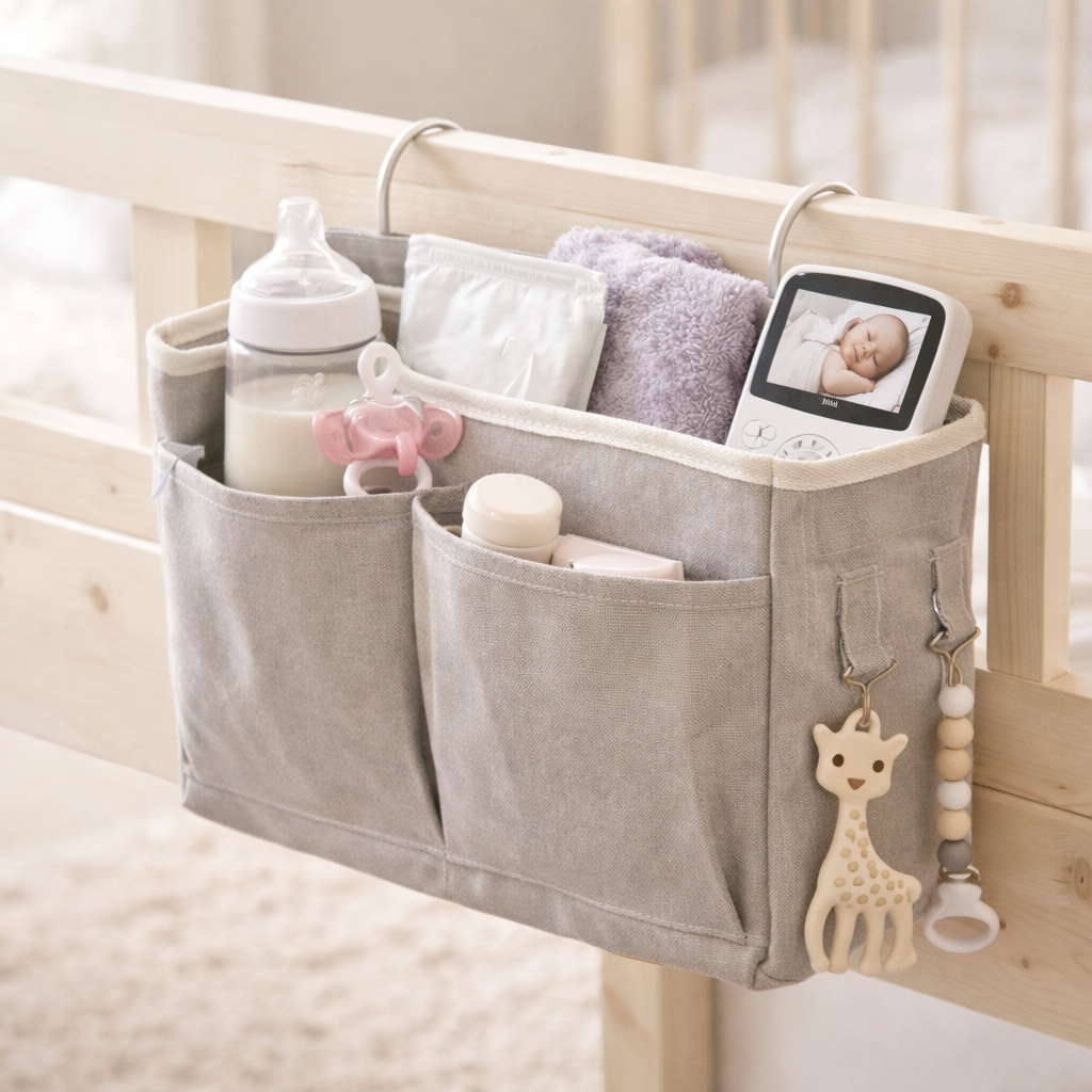 Com compartimentos espaçosos e instalação simples, pode ser utilizado na lateral do berço, da cama ou em outros móveis compatíveis. Ideal para guardar fraldas, lenços, mamadeiras, brinquedos leves ou objetos pessoais.